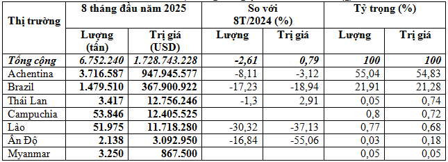 Brazil là thị trường lớn nhất cung cấp đậu tương cho Việt Nam trong 8 tháng đầu năm 2025, chiếm 57,2% trong tổng lượng và chiếm 57,8% trong tổng kim ngạch nhập khẩu đậu tương của cả nước, đạt 1,04 triệu tấn, tương đương gần 483,69 triệu USD, giá trung bình 467,1 USD/tấn, tăng 21,4% về lượng, tăng 12,7% về kim ngạch nhưng giảm 7,2% về giá so với 8 tháng năm 2024; riêng tháng 8/2025 đạt 231.605 tấn, tương đương 110,72 triệu USD, giá 478 USD/tấn, giảm 0,5% về lượng, nhưng tăng nhẹ 0,01% kim ngạch và giá tăng 0,5% so với tháng 7/2025; so với tháng 8/2024 thì tăng rất mạnh 223% về lượng, tăng 220% kim ngạch nhưng giảm 0,9% về giá.