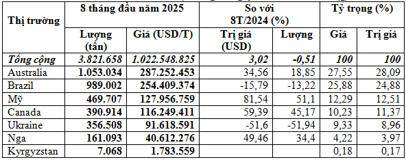 Australia là thị trường lớn nhất cung cấp lúa mì cho Việt Nam trong 8 tháng năm 2025, chiếm 27,6% trong tổng lượng và chiếm 28,1% trong tổng kim ngạch nhập khẩu lúa mì của cả nước, đạt 1,05 triệu tấn, tương đương trên 287,25 triệu USD, giá trung bình 272,8 USD/tấn, tăng 34,6% về lượng, tăng 18,9% kim ngạch nhưng giảm 11,7% về giá so với 8 tháng năm 2024; riêng tháng 8/2025 đạt 229.330 tấn, tương đương 63,44 triệu USD, giá trung bình 276,6 USD/tấn, tăng mạnh 202% về lượng, tăng 200,7% kim ngạch nhưng giảm 0,5% về giá so với tháng 7/2025; so với tháng 8/2024 cũng tăng 404,5% về lượng, tăng 345,7% về kim ngạch nhưng giảm 11,7% về giá.