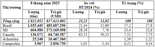 Tiếp đến thị trường Brazil trong tháng 8/2025 tăng 9,5% so với tháng 7/2025 nhưng giảm mạnh 46,7% so với tháng 8/2024, đạt 38,88 triệu USD; cộng chung cả 8 tháng năm 2025 nhập khẩu từ thị trường này giảm 21,2% so với 8 tháng năm 2024, đạt 375,83 triệu USD, chiếm 12,3% trong tổng kim ngạch nhập khẩu nhóm hàng này của cả nước.